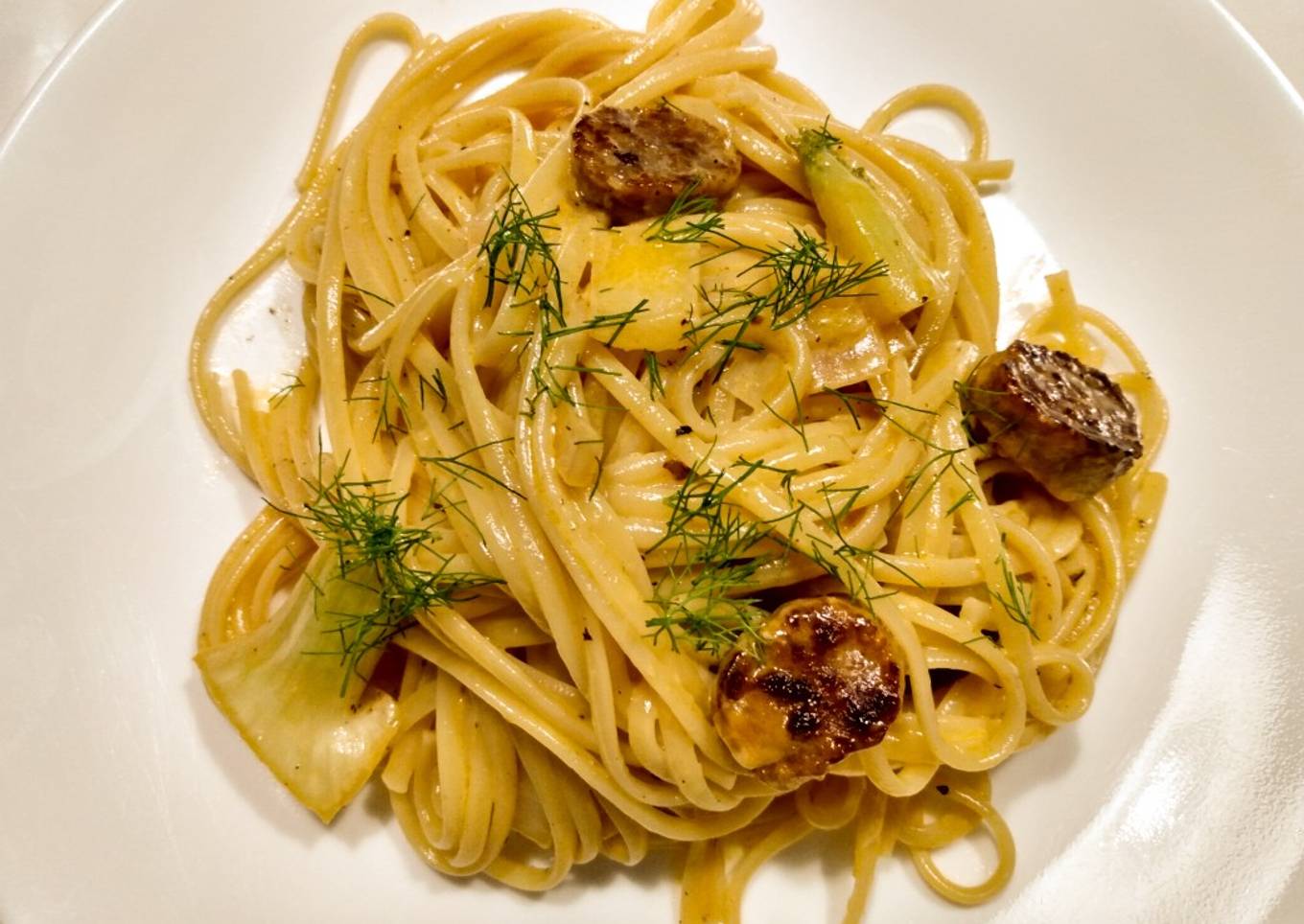 - Add the fennel to the pan of sausages and fry for 2 minutes. Add the shallot and garlic and fry another 2 minutes. Add the lemon juice and a couple of splashes of pasta cooking water and turn the heat down to low.
