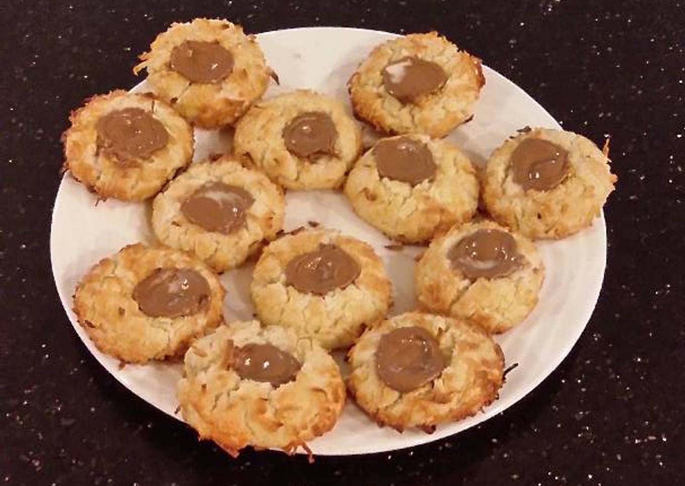 - As soon as the cookies come out of the oven gently press a coconut egg in the center. Cool n on racks