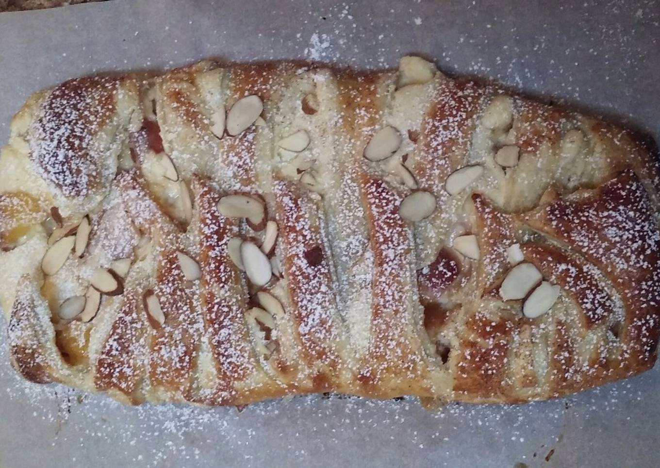 - Bake for 25-30 minutes, until the pastry is golden brown. Once it's done, allow it to cook for 5 or so minutes, then dust with confectioners sugar and top with sliced almonds if you'd like.