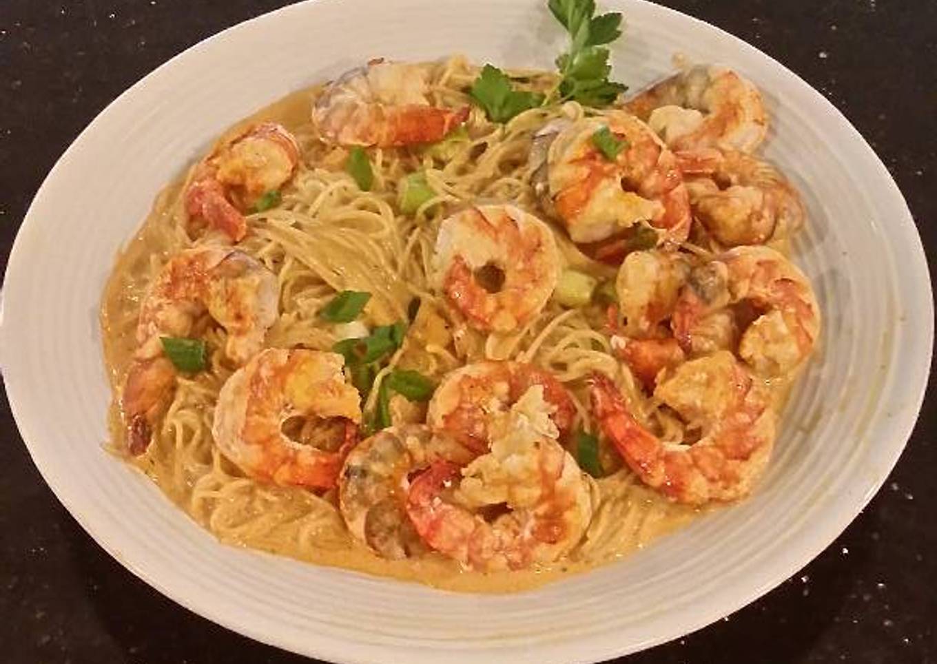 Poached Shrimp with Siriacha Cream Sauce on Angel Hair Pasta