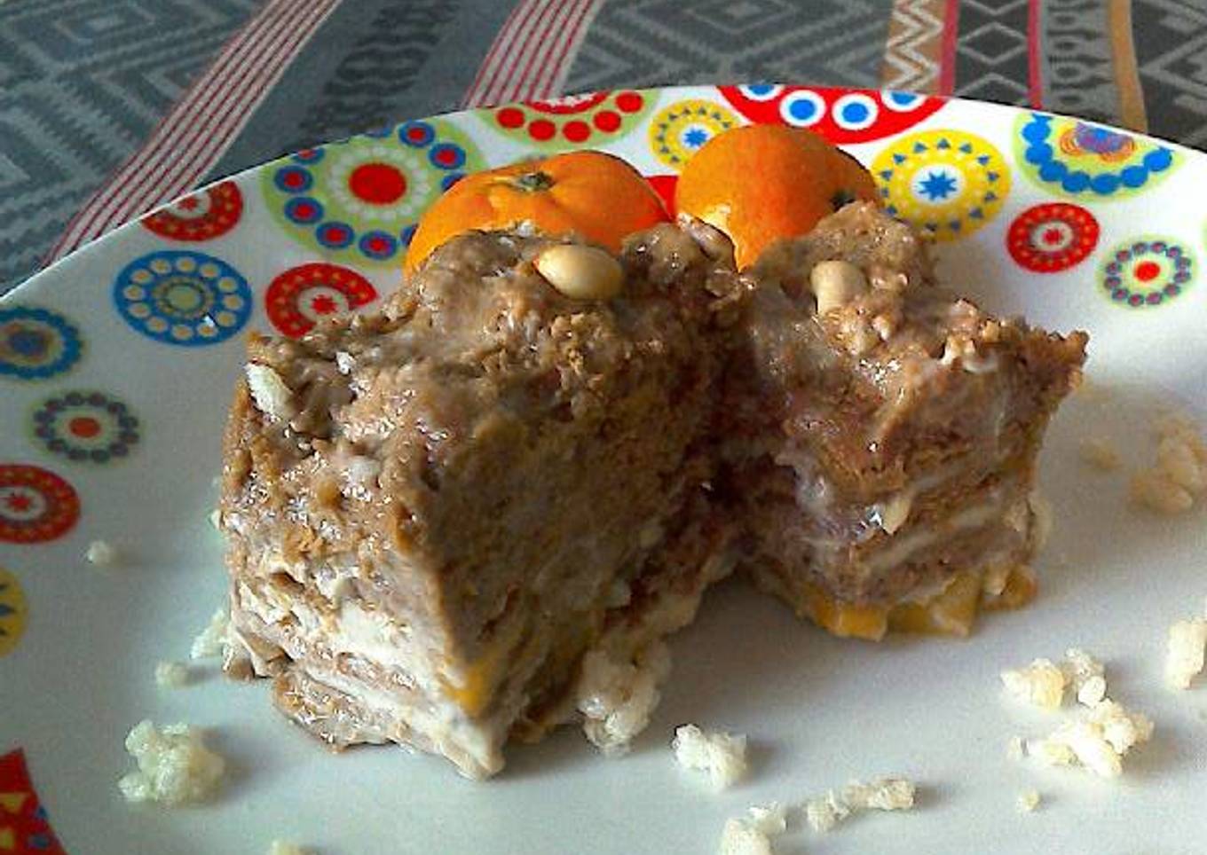 - Put on the crackers a layer of the filling of mangoes, cream, and condensed milk.