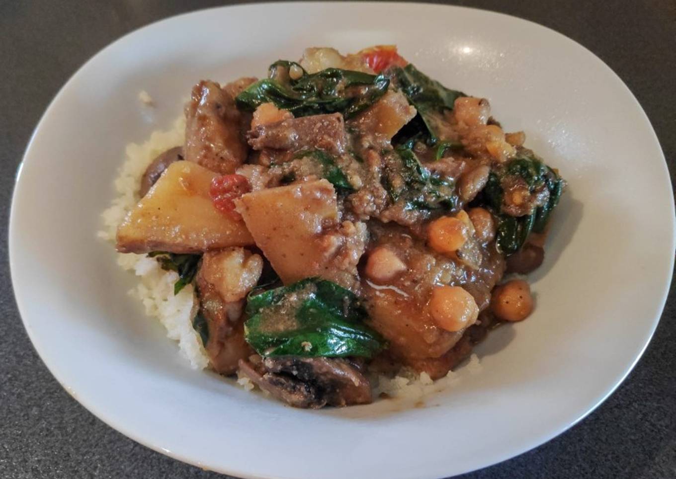 - After approx 30mins (or when potatoes are cooked through), turn off heat, add the spinach and stir. Cover and leave to sit for a couple of minutes (until spinach wilts).