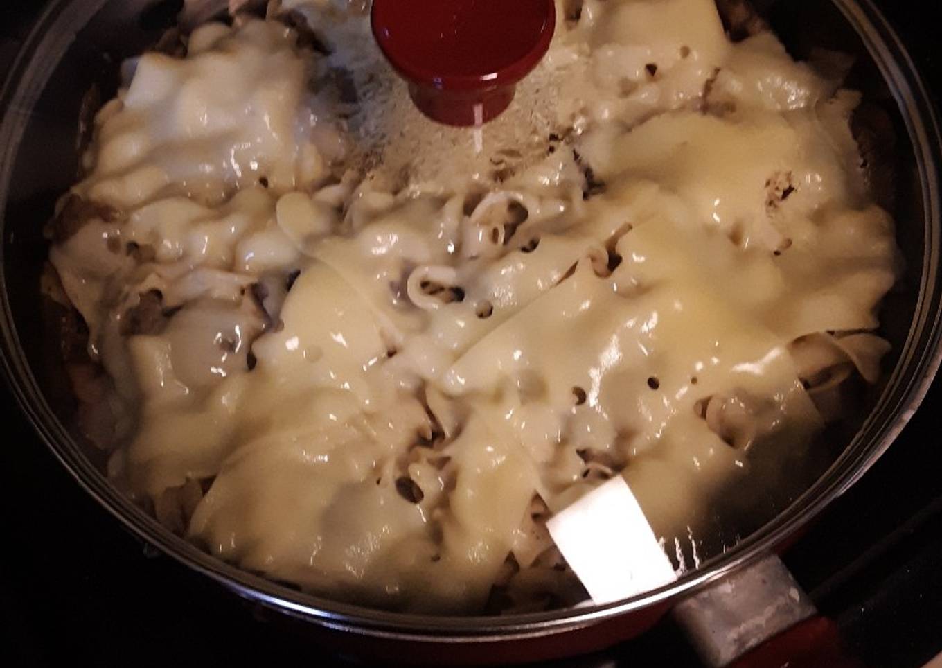 - Once the sauce thickens stir in the sour cream, and add the egg noodles. Season to taste. Top with swiss and put a lid on it let it sit over low heat untill the cheese melts.