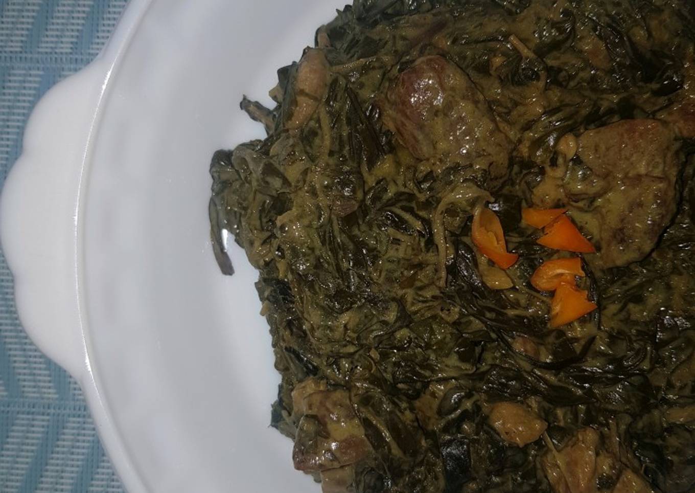 A traditional Filipino delicacy with simple ingredients. Made of dried taro leaves, coconut milk, meat or seafood, chilli peppers, onions, garlic, and ginger.