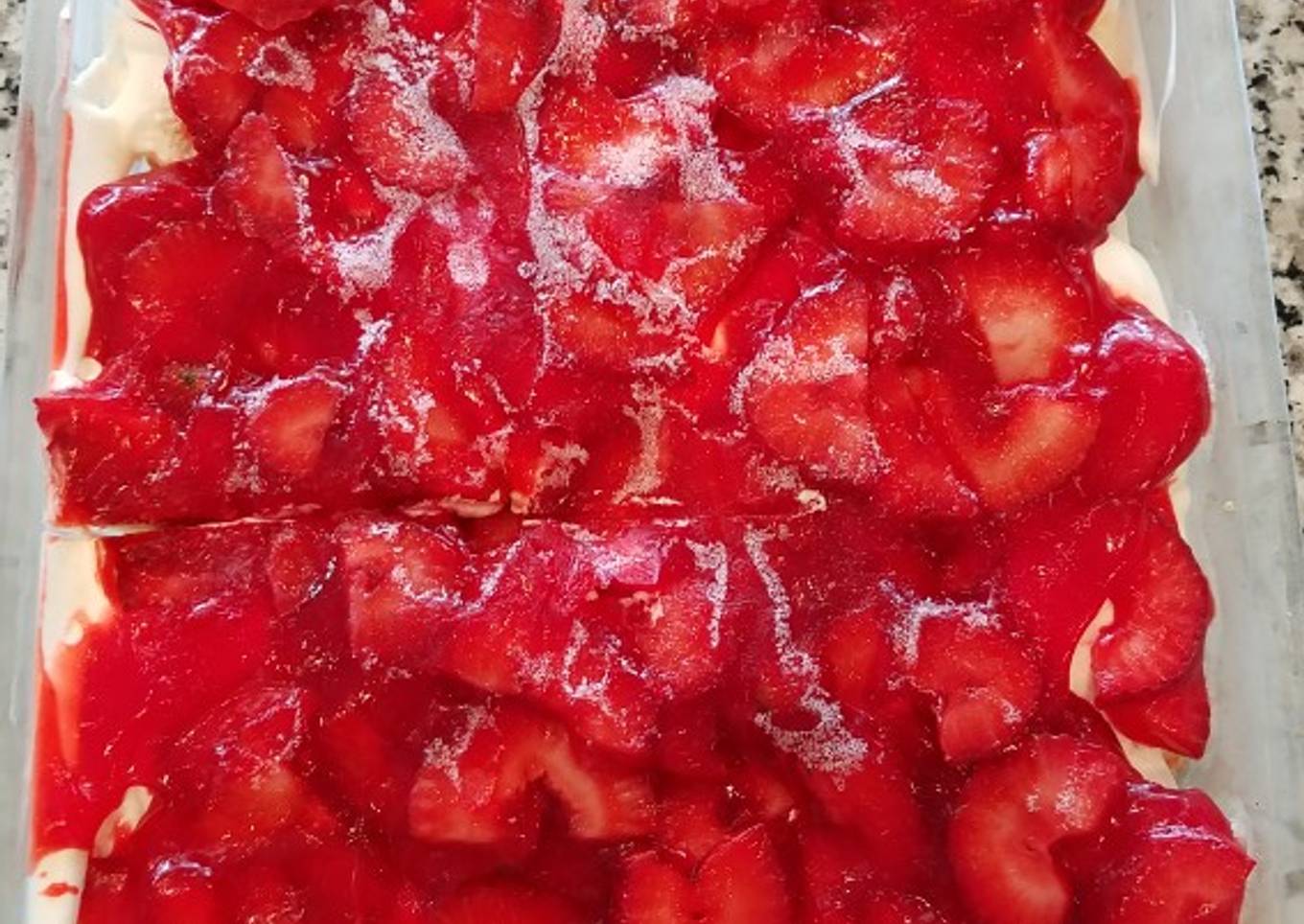 - In a bowl, combine strawberries and glaze until strawberries are evenly coated. Spread this mixture evenly over cream cheese mixture.