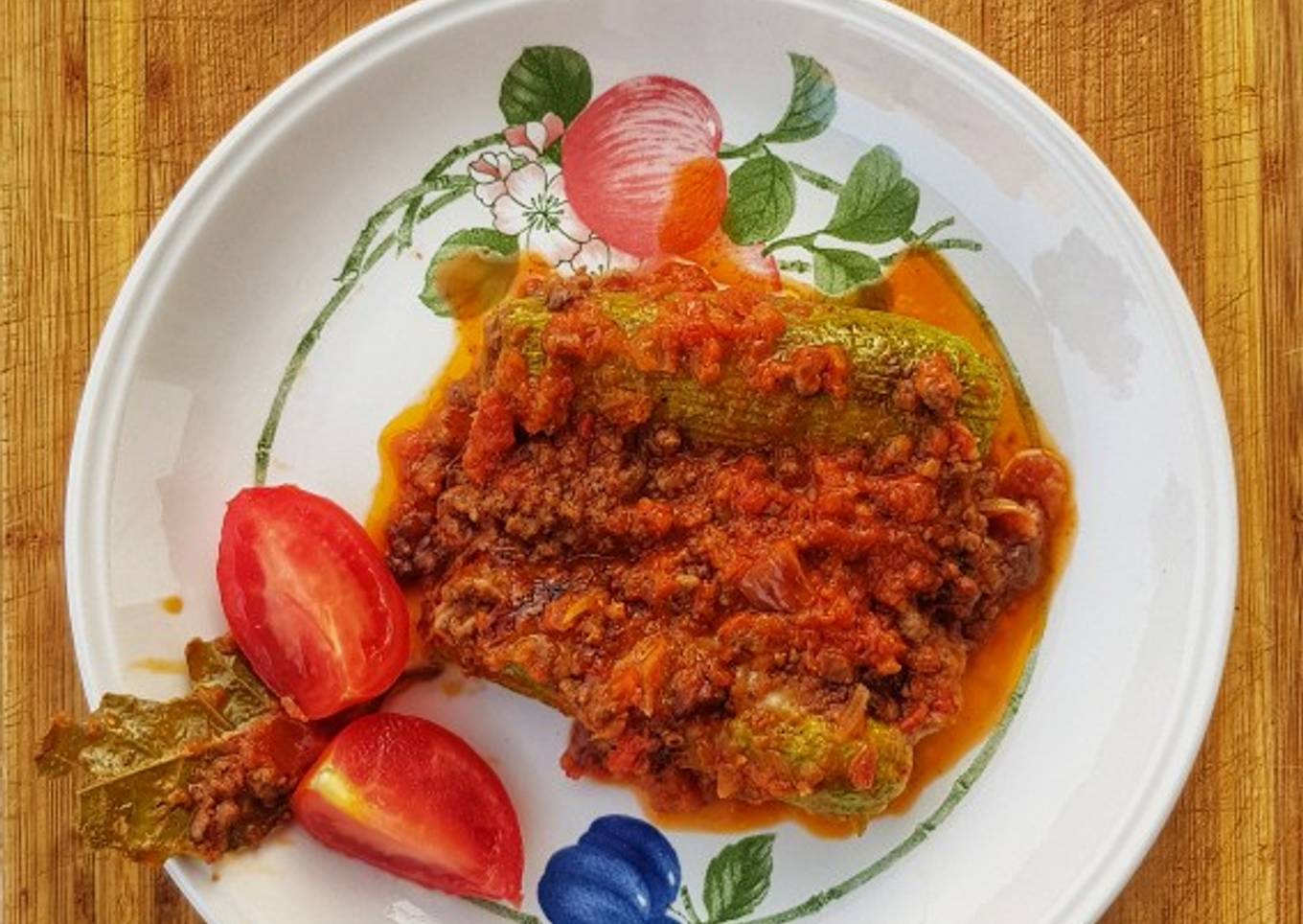 Fried zucchini stuffed with minced beef, simmered in red tomatoe sauce and crust of beautiful golden melted mozzarella!