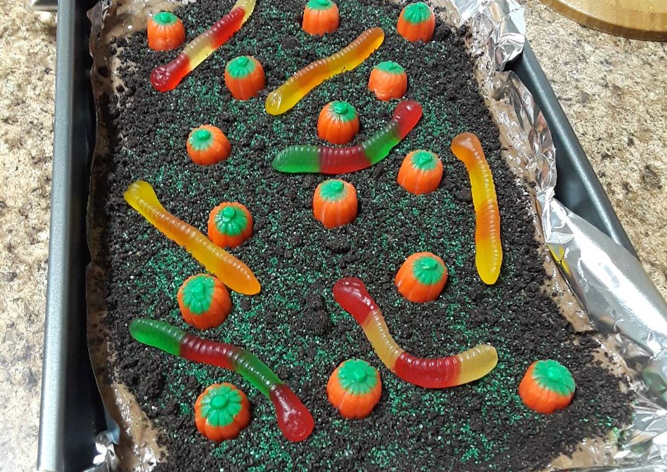 - Lightly grease a 9x13" baking pan. Pour out the pudding mix into the pan and spread it out. Then sprinkle the remaining oreo crumbs evenly over the top. Decorate it however you'd like (some ideas in the ingredient list), then cover it with more foil and store in the refrigerator until you're ready to serve. It's already thick to begin with, but will thicken up more the longer it is refrigerated.