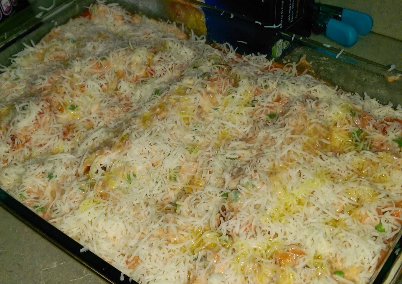 - Sprinkle the shredded mozzarella on top then drizzle virgin olive oil. Baked until bubbly and golden brown. 30-35 minutes.