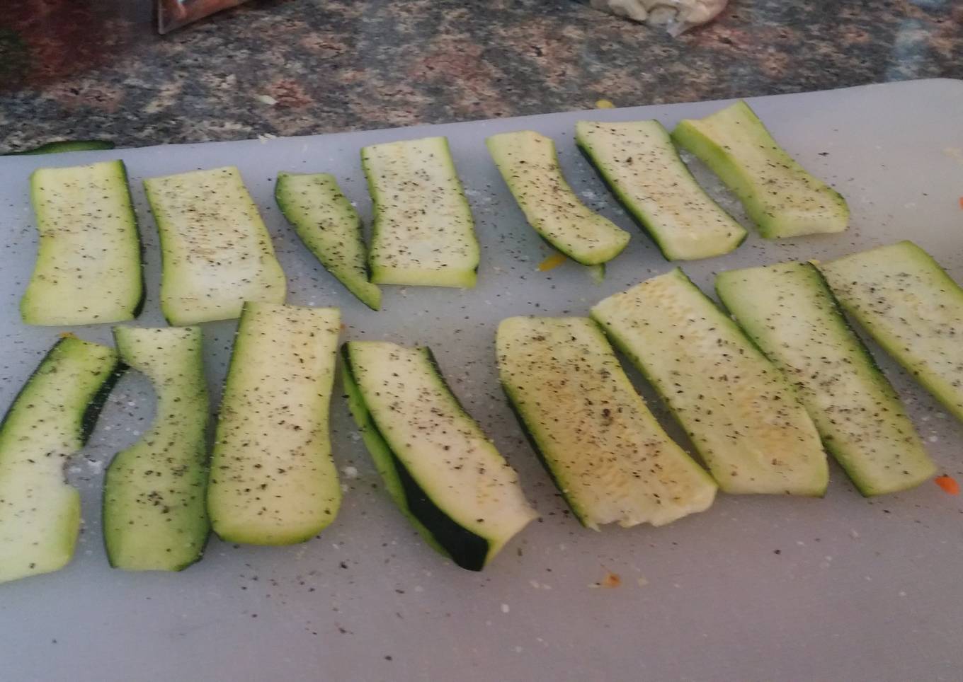 - Add pil to a frying pan and lay out the courgettes so that they are easier to turn. Approx. 2-3mins on each side, depending on the thickness. I made mine super crispy and almost burnt