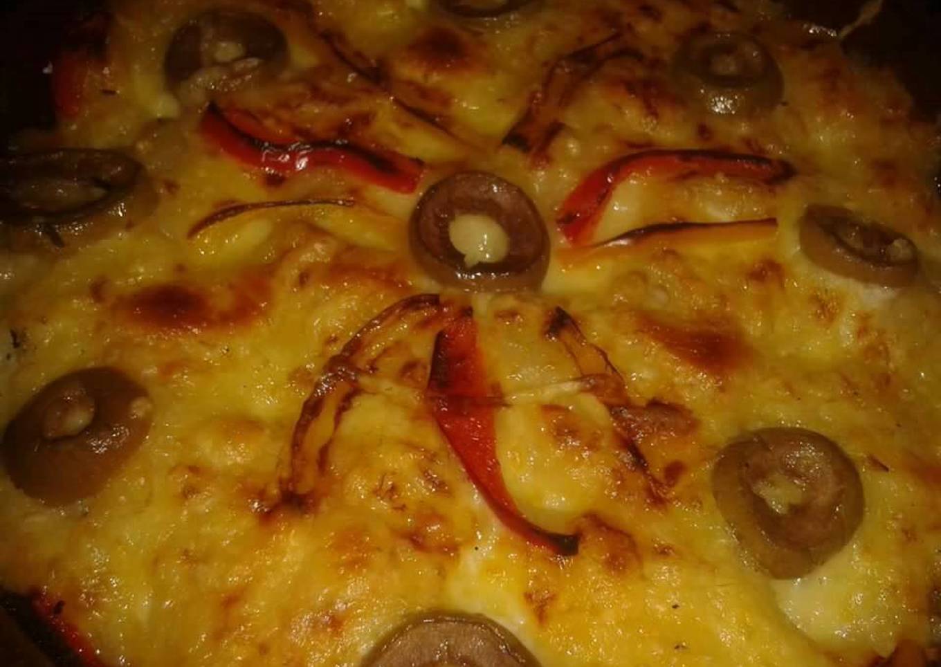 - In a round clay pot we add a bit of the sauce. We then mix the pasta with the rest of the sauce and put one layer in the pot. Then our filling then a looot of mozarella then the rest of the pasta. For the topping we add mozzarella bell peppers and olives. We put it in a medium to high heat oven for 10 minutes, then open the oven grill til it gets that golden color 😍😍